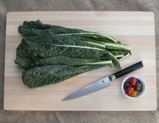 In size, the Shun Classic Utility Knife is between a chefs knife and a paring knife, but its blade is narrower and straighter. It is perfect for a multitude of small tasks where more precise cuts are needed, such as trimming broccoli, green beans, or other smaller vegetables. Some cooks like to use it in their hand, too—almost like a large paring knife. Others like its smaller size as an alternative to the chef’s knife. Its very slightly curved belly enables it to do moderate rocking cuts. It’s nimble enough to peel an onion in hand, then slice it up in short order.