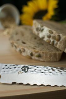 If you bake or buy whole loaves of bread, a bread knife will be one of the most-used knives in your kitchen. Whether you love wonderfully crusty or delicately tender bread, the Shun Premier Bread Knife will be your loaf's new best friend, no matter what its texture. The key is Shun’s razor-sharp, wide, “low frequency” serrations. Unlike a plain-edged knife, the serrations let you gently saw through the bread without crushing and with much less crumbing. Unlike sawtooth serrations that are spaced closer together, the Shun Premier Bread Knife’s wide serrations will gently glide through the bread without tearing. This keeps the bread’s texture intact and enhances eating pleasure. Cakes and pastries also benefit from the Shun Premier Bread Knife’s smooth cutting capabilities.
