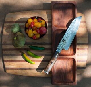 The Shun Premier 18cm Santoku is a beautiful, Asian-inspired chefs knife that many cooks today have added to their kitchen favourites. The Santoku is as easy to use as a chefs knife and is especially well suited to a down-and-forward cutting motion (push cut). Slightly shorter than the standard chefs knife, the Shun Premier Santoku is light, agile, and very easy to manoeuvre. There's just enough belly curve to enable rocking cuts, which just adds to the Premier Santoku's versatility. Many cooks swear by their Santoku for top performance.