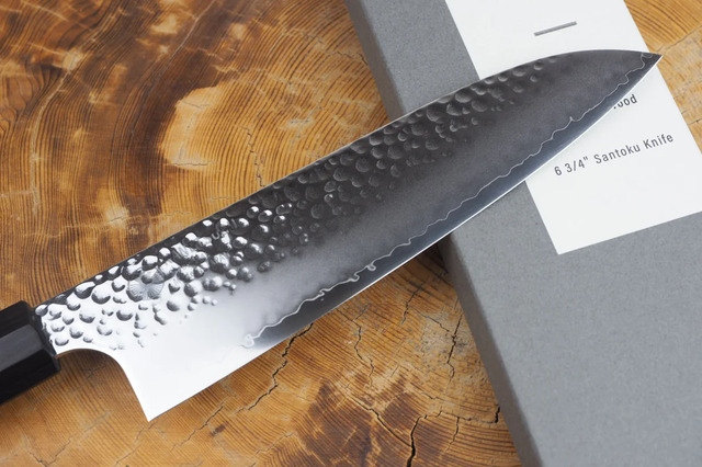 A hammer- finished, three-layer steel blade with a VG-2 core and a Rockwell hardness of 59. A hepatagon handle ( hex-shaped ) made of Pakkawood and a Micarta ferrule. Great value for money.