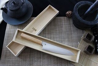 To finish with a bang, we cannot forget to talk about this knife's packaging. This santoku knife comes in a wooden box with the Shizu Hamono logo engraved on its top surface. Forget about the traditional cardboard box in which most knives are sold, with this wooden box, this Shizu Hamono knife is the perfect gift for any passionate cook!
