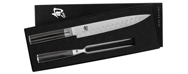 The Shun Classic 2 Piece Carving set is beautifully presented in a special Shun wooden gift box. Each set contains a Shun Classic Carving Knife 20cm (DM0703) and Shun Classic Carving Fork 16cm (DM0709).