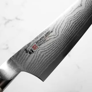 Classic Damascus Pakka A collection characterized by excellent cutting properties and a distinctive, minimalist design ideal for modern kitchens. The VG-10 core enveloped in 32 layers of Japanese steel creates the characteristic "Damascus" pattern on the blade, which harmonizes beautifully with the riveted handle made of black pakka wood. Mcusta Zanmai MCUSTA, a Japanese company founded in 1964, specializes in producing high-quality kitchen knives. Their expansion has reached the world, allowing both domestic and professional users to enjoy knives with professional edges. The word ZANMAI is synonymous with luxury, which is of paramount importance in the production of each knife. In the initial stage, the knives are laser-cut from steel sheets, resulting in high hardness. They are then cold-forged to increase steel density, wear resistance, and the aforementioned hardness. The key to Mcusta's knife quality is their manual assembly, emphasizing their quality and uniqueness.