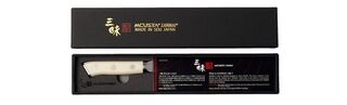 This collection is characterized by excellent cutting properties and a distinctive, minimalist design, perfect for modern kitchens. The VG-10 core wrapped in 32 layers of Japanese steel creates the characteristic "Damascus" pattern on the blade, which beautifully complements the riveted handle made of white Corian composite. Mcusta Zanmai A Japanese brand specializing in knife production since 1964. "Mcusta" stands for luxury, which translates into meticulous attention to detail in the products of this manufacturing company. Modern technologies, such as laser-cutting of blades and cold forging, combined with manual assembly, result in some of the best knives in the world.
