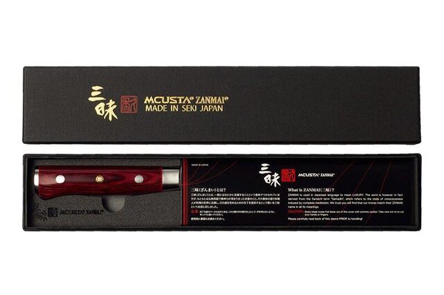The Pro Flame series of knives is a great addition to any kitchen. The knives are made of stainless VG-10 steel wrapped in 32 layers of stainless steel with a hardness of 61 HRC +/-1, ensuring optimal cutting properties and ease of sharpening. Cold forging of the blades increases steel density, resulting in greater wear resistance and higher hardness. The handles of knives in this line are made of distinctive red laminated wood, "pakka wood." The handles are ergonomic, reinforced with three metal rivets, and finished with a flat layer of metal. Mcusta Zanmai MCUSTA is a Japanese company founded in 1964, specializing in the production of high-quality kitchen knives. Their expansion has reached worldwide, allowing users to enjoy professional-quality blades in both home and professional settings. The synonym for the word ZANMAI is luxury, which is of paramount importance in the production of each knife. In the first stage, the knives are laser-cut from steel sheets, resulting in high hardness. They are then cold-forged, increasing steel density, wear resistance, and the aforementioned hardness. Key to the quality of Mcusta knives is their hand assembly, emphasizing their uniqueness and quality.