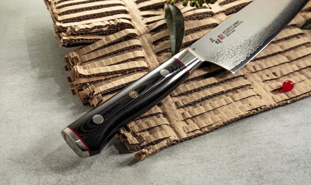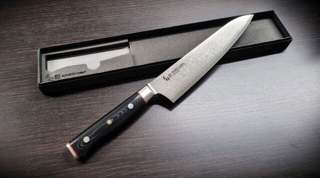 The chef's knife from the Japanese brand Mcusta Zanmai is a must-have for enthusiasts of the finest Japanese knives. This tool boasts incredible sharpness and a unique design, making it perfect for chopping herbs, cutting meats and vegetables, and thanks to its wide blade, for easy transport. The handle is made of black micarta, a highly regarded material in knife production. Micarta is a composite obtained from linen, canvas, and carbon fiber. Micarta is known for its high resistance to mechanical damage, high temperatures, and moisture.